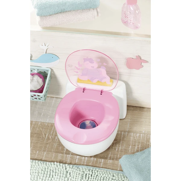 BABY geboren is al een grote meid. Ze gaat met vertrouwen naar het toilet. Ze zit niet eerder op haar witte troon met een roze bril dan dat er plasgeluiden, applaus en het tevreden lachen van BABY born te horen zijn. De kleine maakt zelfs een groot probleem. In de kom verschijnt een kleurrijke glinsterende stapel poep. Maar nu snel afspoelen. Druk op de spoelknop en de stapel verdwijnt, vergezeld van spoelgeluiden.