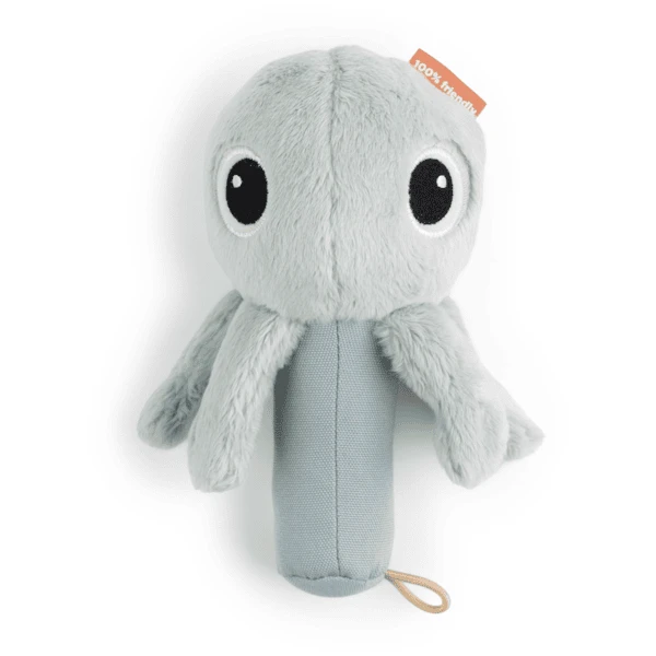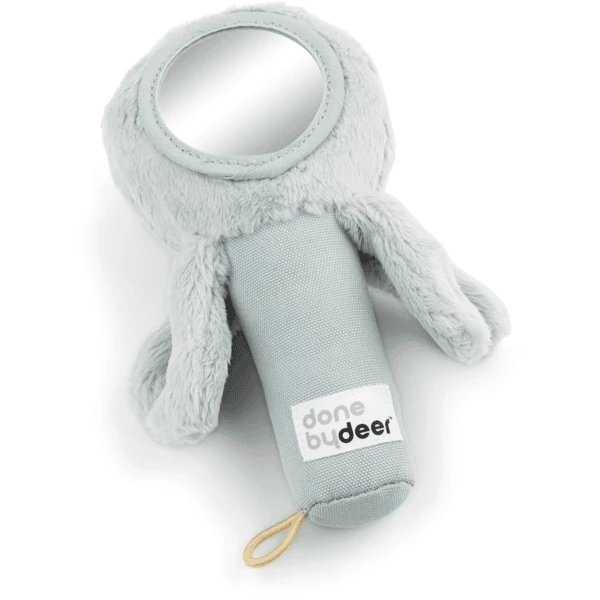Het spiegeltje op de achterkant is bijzonder opwindend voor baby’s. De zachte armen van de gelei rammelaar knisperen vrolijk als kleine handjes ze verkennen. Het handvat is gemakkelijk vast te pakken en piept als je erop drukt.