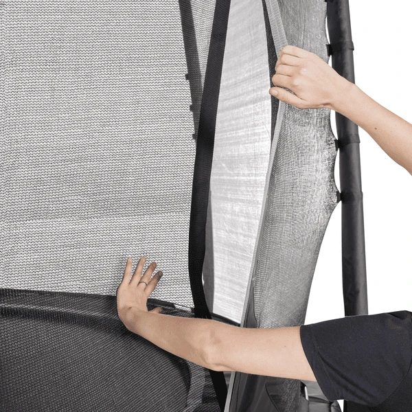Het zwarte frame, de subtiele kleurdetails en de reflecterende bies geven de trampoline een robuuste uitstraling: een pronkstuk in elke tuin.