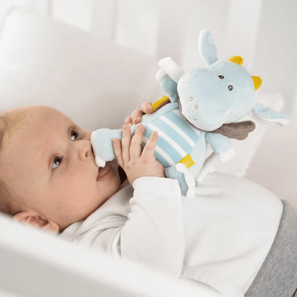 Door de sluiting te openen kan het speeluurwerk uit de koala gehaald worden om te wassen. De schattige draak wordt met twee banden makkelijk aan het bedje, kinderwagen of autostoel bevestigd. Als knuffeldier of hulp om in te slapen. De draak is zowel thuis als onderweg een echte blikvanger en wordt snel de beste vriend van je kindje.