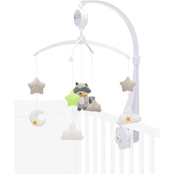 Hij kan gemakkelijk aan elk standaard kinderbedje worden bevestigd. De motieven kunnen gemakkelijk worden verwisseld of verwijderd en kunnen in de machine worden gewassen op 30 graden.