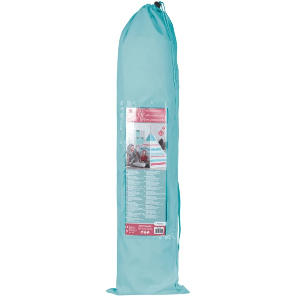 De tipi voor kinderen heeft een retro-look. Zigzagmotief en strepen met kleuren in het Color blok Design wisselen elkaar af. De aardkleurige tinten in bruin en grijs die op het onderhoudsvriendelijke tentdoek worden gebruikt, zorgen voor een vriendelijke sfeer en maken de speeltent tot een decoratief object dat geschikt is voor elk interieur. De constructie wordt als een echte tipi vastgehouden door vier stokken waarover het tentdoek zich uitstrekt. De ingang kan over de gehele breedte worden geopend en biedt helderheid, maar kan ook worden afgesloten met de ingenaaide klittenbandsluitingen. Tegenover de ingang bevindt zich een rond raam met gaasweefsel voor bescherming tegen insecten en ventilatie. Na gebruik wordt de tent eenvoudig weer gedemonteerd om ruimte te besparen en opgeborgen in de bijgeleverde tas, bijvoorbeeld onder het bed of op de kast.