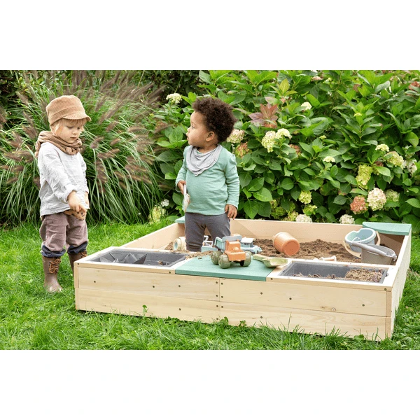 - Deze Sand box is niet alleen een visueel hoogstandje light , maar biedt nog meer: twee kleine afgeronde bankjes, een opbergvak met deksel in het midden, een Sand boxvlies en een afdekfolie.