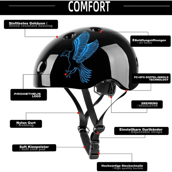 - Dankzij de functies blijft de helm stevig op het hoofd zitten en altijd in de juiste positie.