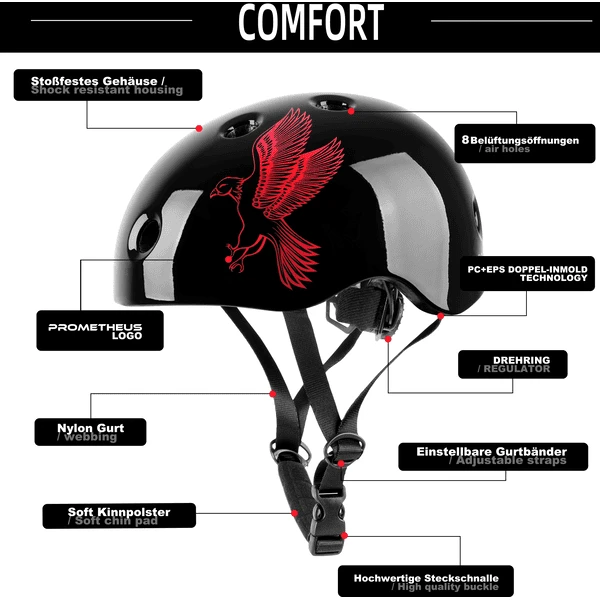 - Dankzij de functies blijft de helm stevig op het hoofd zitten en altijd in de juiste positie.