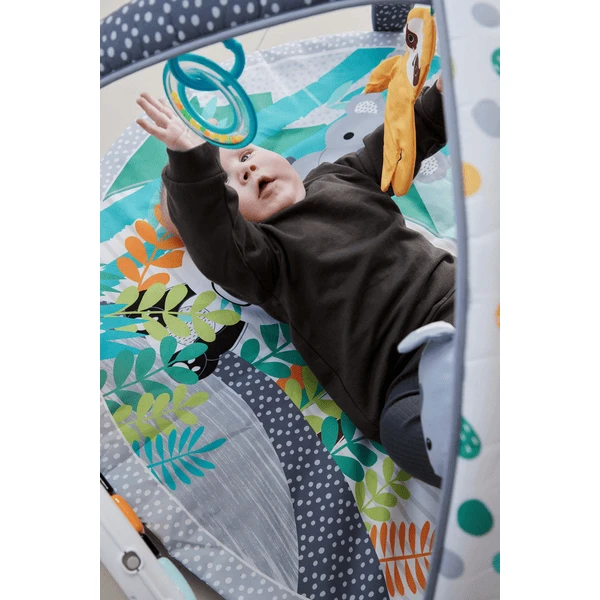 - De speelboog is bevestigd aan een zachte speelmat met een fascinerend dierenmotief