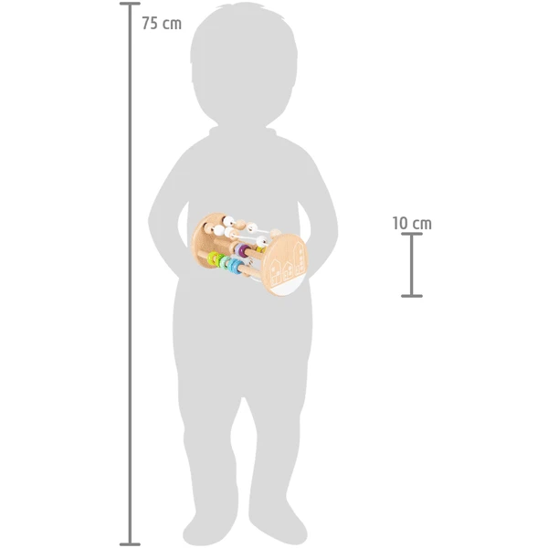 Door drie motoriek spiralen vinden de ballen hun weg. Bij het schudden bewegen de houten schijven en maken daarbij geluid.Afmetingen: ca. 10 x 10 x 19 cm Aanbevolen leeftijd: vanaf 12 maanden