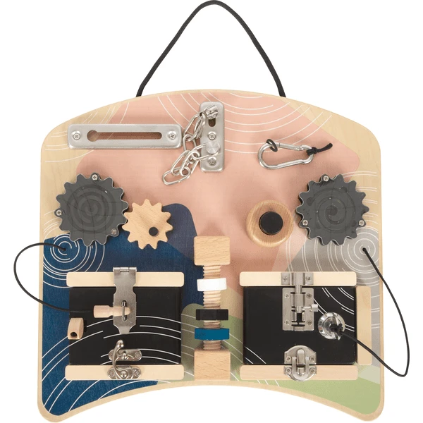 - Extra functies zoals een tandwielspel met minidoolhof of een draadstang met verticale draaielementen en een pieptoeter ronden de activiteit board af.