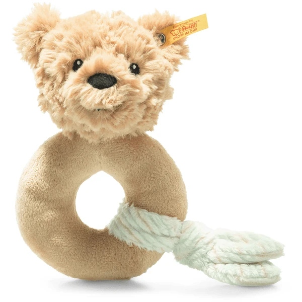 De Jimmy Teddybeer grijpspeeltje met rammelaar heeft een stevige ring, een doekje met knoop en een knuffelig teddybeerhoofd met geborduurde ogen, neus, mond, lange oren en rammelaar – om te voelen, horen, zien, grijpen en bewegen!