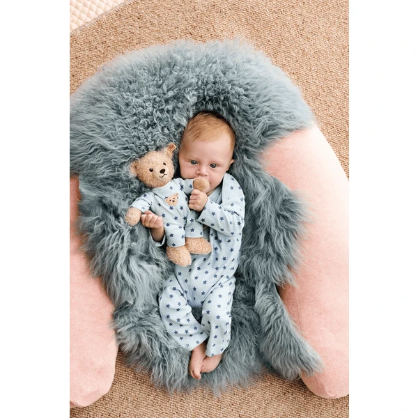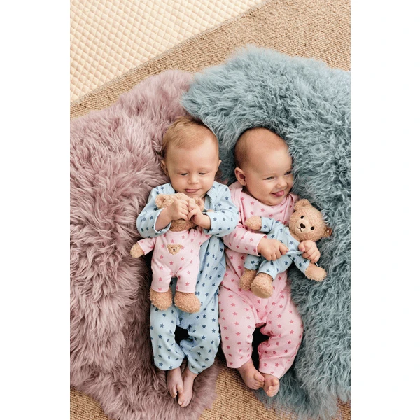 Teddy en ik Teddybeer jongen baby met pyjama is 25 cm lang en gemaakt van knuffelzacht beige pluche. De zolen en de poten zijn, net als de mond, in korter beige materiaal afgezet. De neus en de mond zijn uitvoerig gegarneerd. De pyjama’s zijn blauw met donkerblauwe sterrendruk en teddyberenkop applicatie in beige.