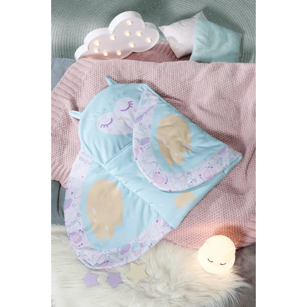 - “WhooHoo, Baby Annabell zal hier in een mum van tijd slapen!” Eerst wordt de kleine dromer in het midden van de blauwe puck deken gelegd, zodat de achterkant van haar hoofd zich comfortabel nestelt tegen het gezicht van de uil
